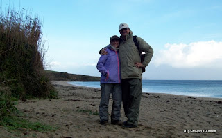 Next morning with picnic lunch and decked out in wet weather clothes we set off from our van park on the Coastal Walking Path. As it had been previously raining and now threatening to do also the path was muddy and slippery in places. Walking along the cliffs gave us a picturesque scene of the beaches and ocean and farmers fields on the other side.